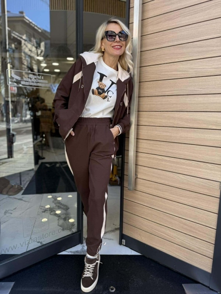 Комплект суитчер и панталон от трико в кафяво и бежово. Суитчерът е с цип и качулка. Панталонът е с ластик на талията и в долната част на крачолите.