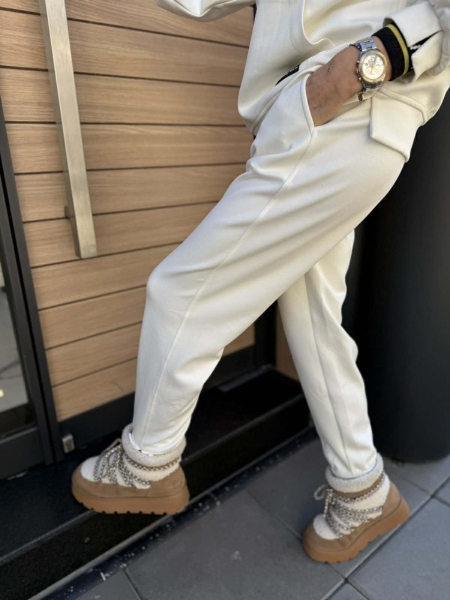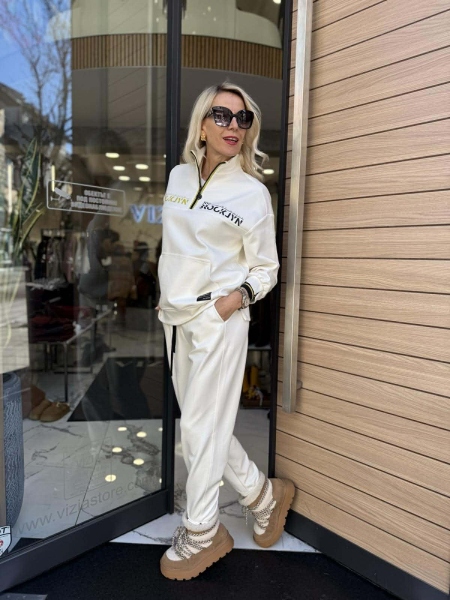 Комплект от трико в две части в бял цвят. Горната част е със свободна кройка, висока яка с цип. Панталонът е с ластик на талията и в долната част на крачолите.