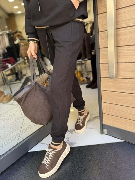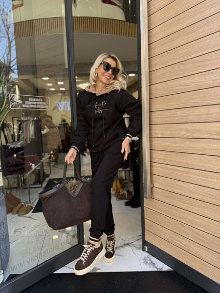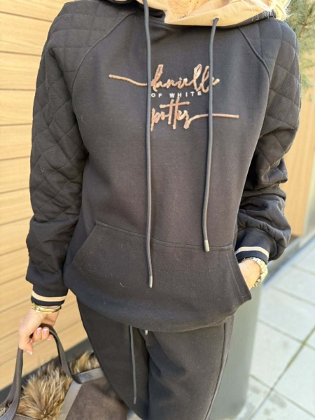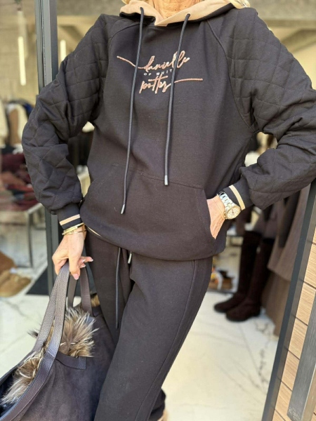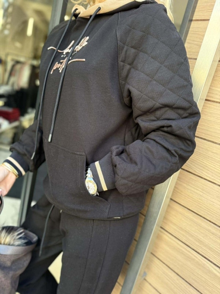 Комплект от трико в черен цвят. Горната част е суитчер с капитонирани ръкави и качулка. Панталонът е с ластик на талията и краищата на крачолите.