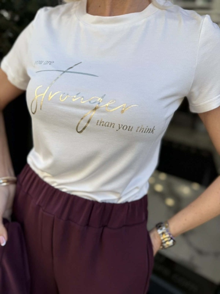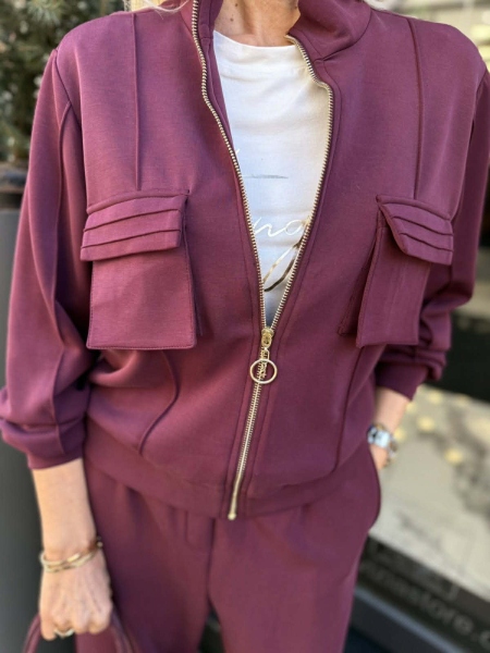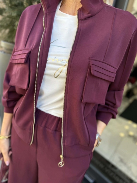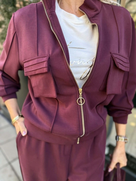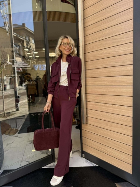 Комплект от три части в цвят бордо от трико. Горната част е тип якенце с предни джобове и метален цип. Блуза с къс ръкав в бял цвят. Панталонът е с широки крачоли, застик на талията и странични джобове.