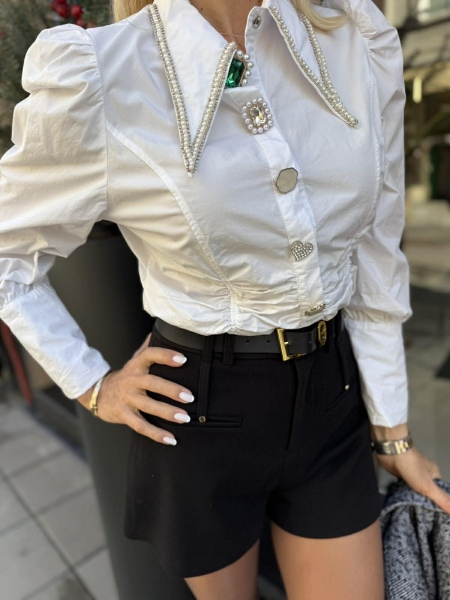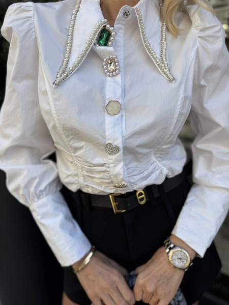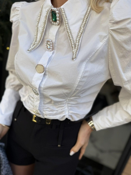 Риза в бял цвят с декорация от перли и камъчета. Моделът е с втален силует, остра яка и закопчаване с копчета. Универсален размер подходящ за S, M.