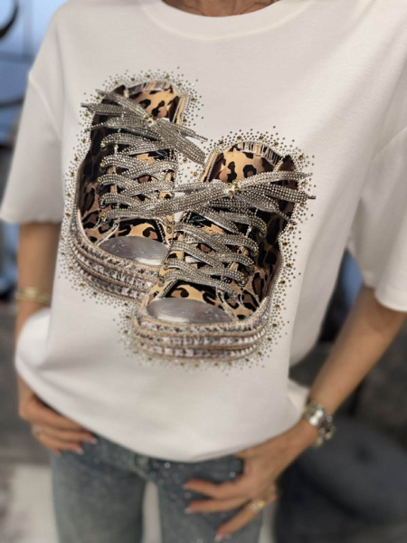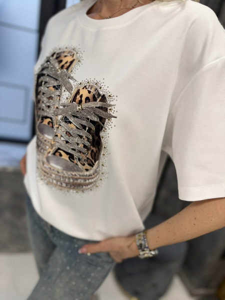 Тениска от трико в бял цвят с цветна апликация. Моделът е универсален размер със свободен силует.