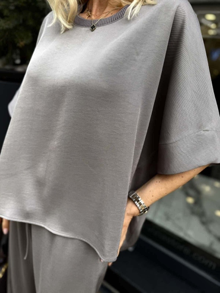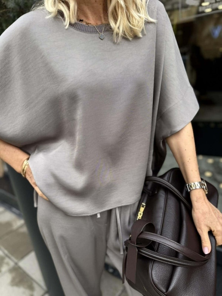 Комплект блуза и панталон от фина материя в сив цвят. Блузата е oversize модел с ластично деколте. Панталонът е с широки крачоли, ластик на талията.