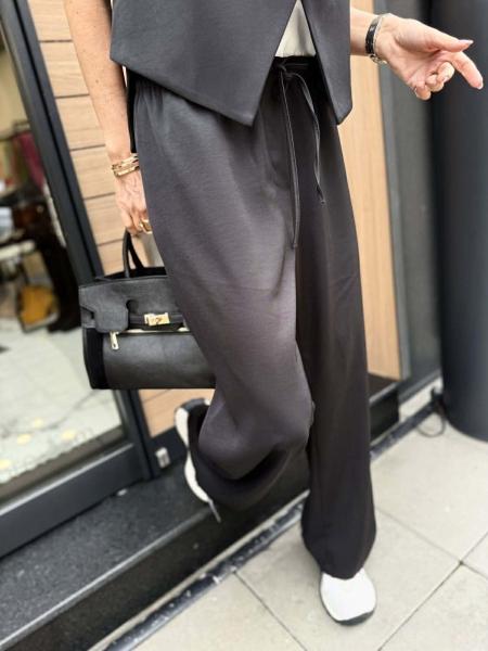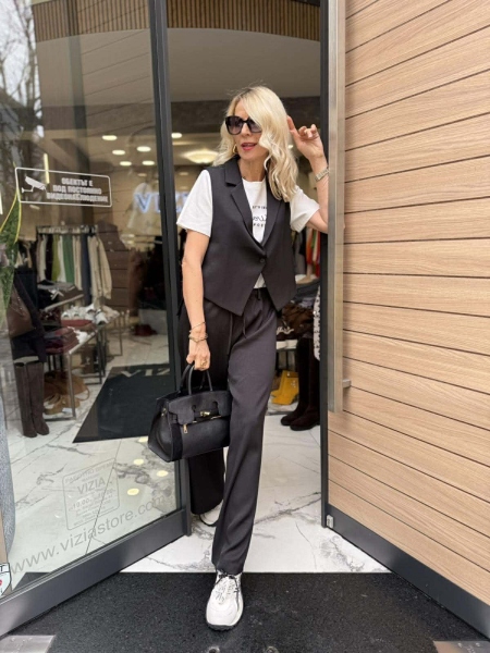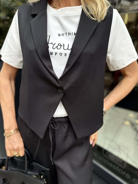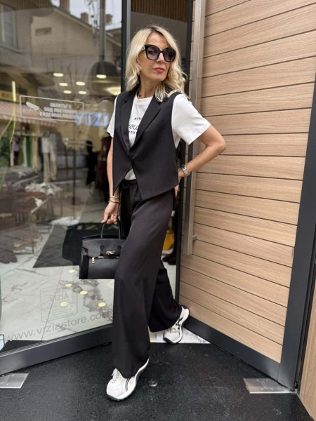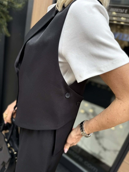 Комплект елек и панталон в черен цвят. Елекът е с ревери и интересна странична част. Панталонът е с широки крачоли и ластик на талията.