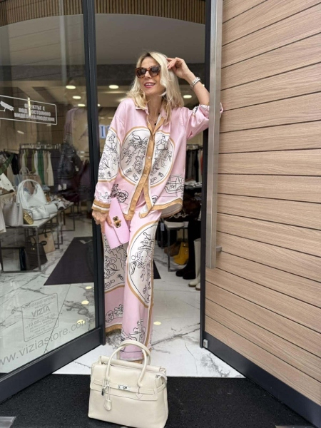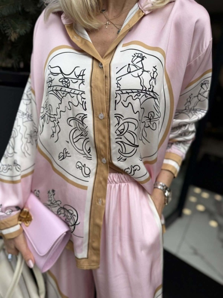Комплект риза и панталон от фина сатенирана материя с цветен десен. Ризата е oversize модел с яка и копчета. Панталонът е с широки крачоли и ластик на талията. Универсален размер подходящ за M, L, XL.