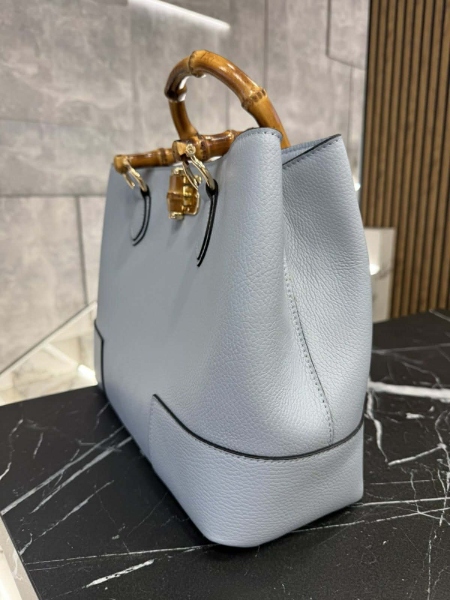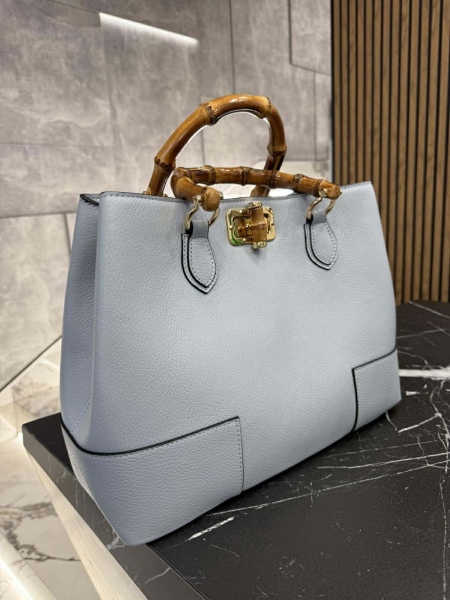 Чанта от естествена кожа в светло син цвят. Моделът е с две къси дръжки, една дълга с възможност за сваляне и две прегради.