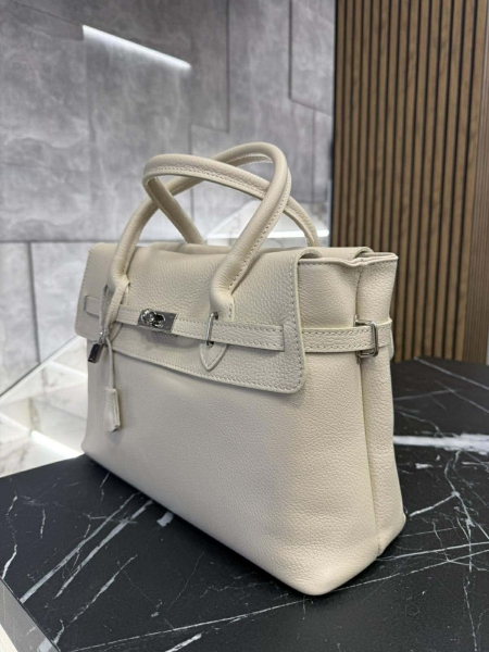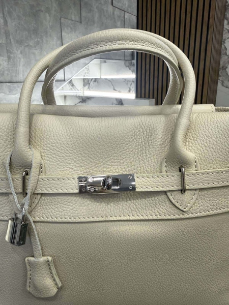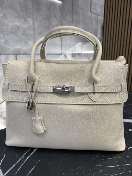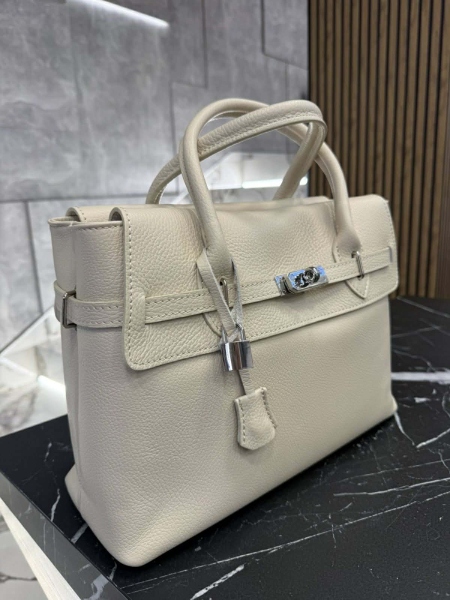 Чанта от естествена кожа в бежов цвят с две къси дръжки, закопчаване с цип и две прегради.