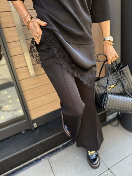 Комплект блуза с къс ръкав и панталон от трико в черен цвят. Блузата е със свободна кройка и има пришита долна част от сатенирана материя и дантела. Панталонът е чарлстон с ластик на талията. Универсален размер подходящ за S,M.