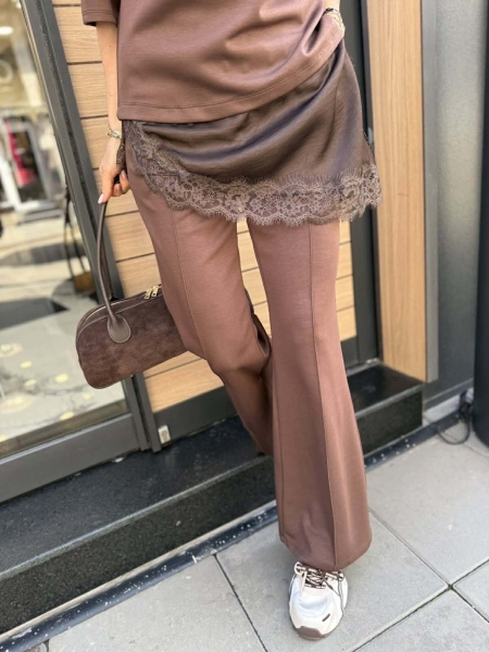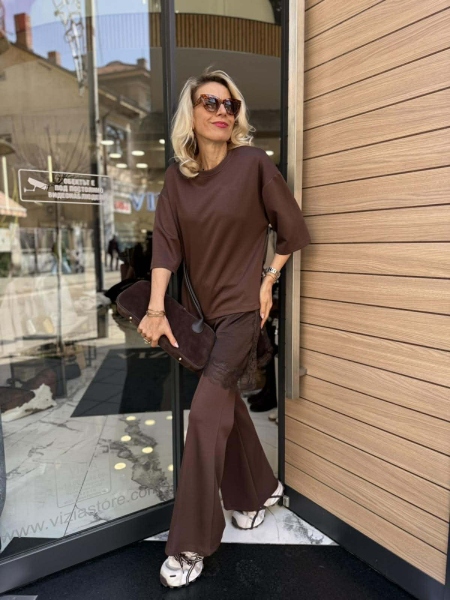 Комплект блуза с къс ръкав и панталон от трико в кафяв цвят. Блузата е със свободна кройка и има пришита долна част от сатенирана материя и дантела. Панталонът е чарлстон с ластик на талията. Универсален размер подходящ за S,M.