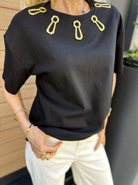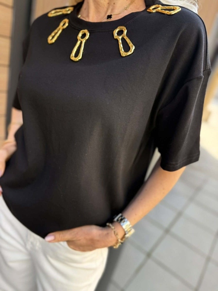 Тениска в черен цвят от трико с oversize кройка и декорация на деколтето. Универсален размер.