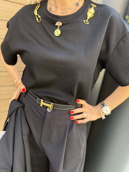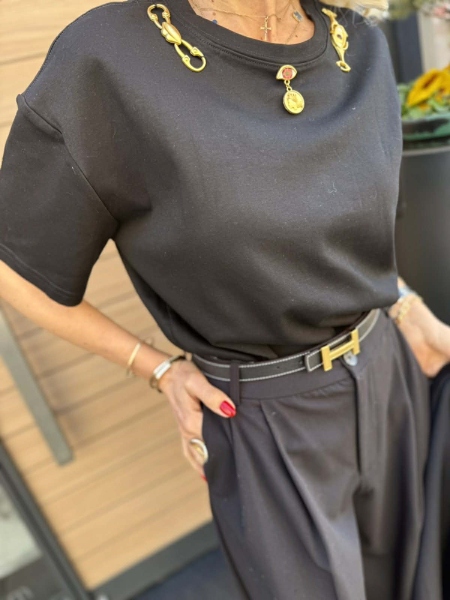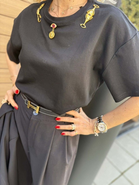 Тениска от трико в черен цвят с декорация на деколтето. Универсален размер със свободна кройка.