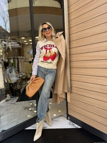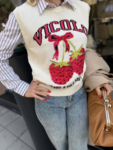 Елек от фино плетиво в цвят екрю с цветна щампа. Универсален размер подходящ за S, M.