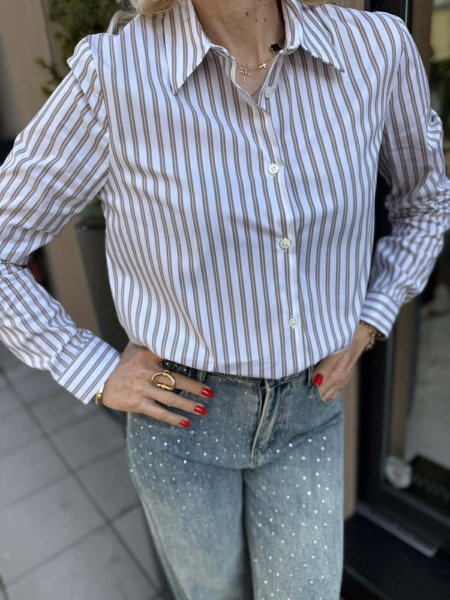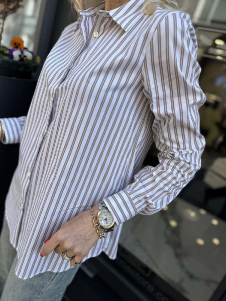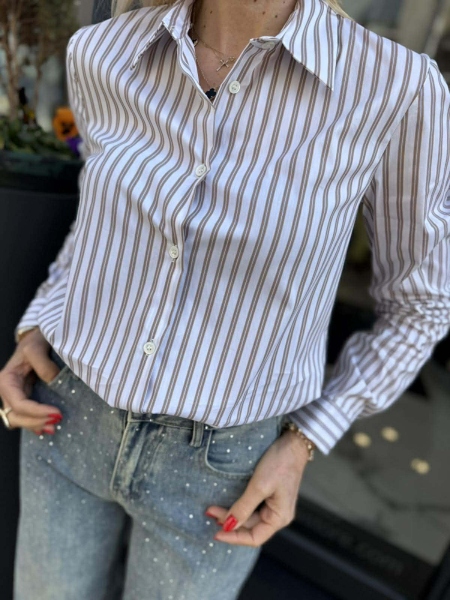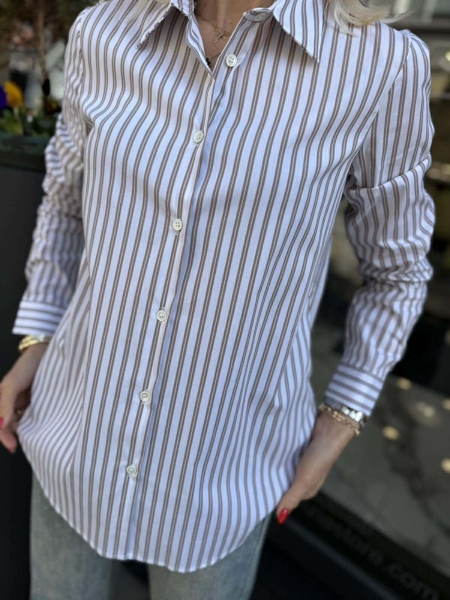 Риза с раиран десен. Моделът е с права кройка, якичка и закопчаване с копчета. Универсален размер подходящ за S, M.