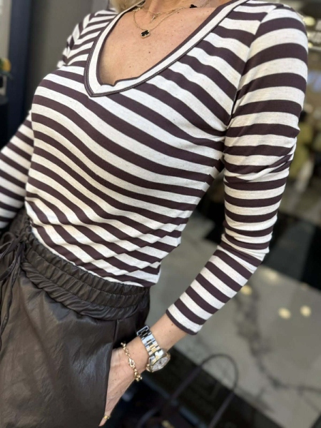 Блуза от фина материя с раиран десен и остро деколте. Моделът е по тялото. Универсален размер.