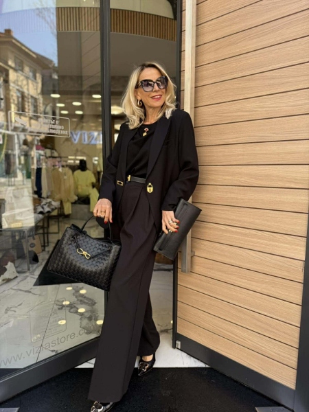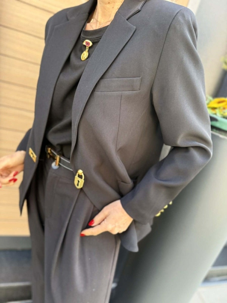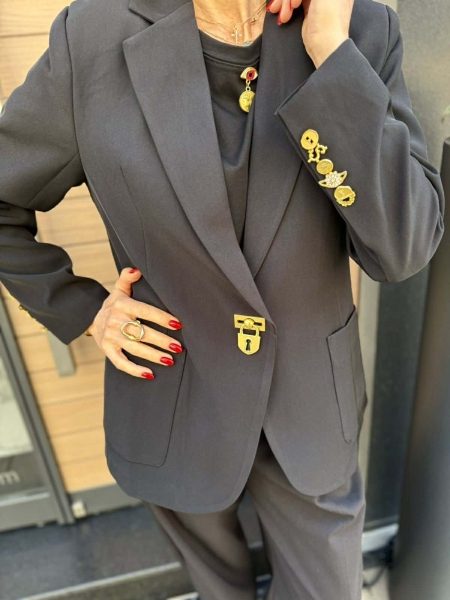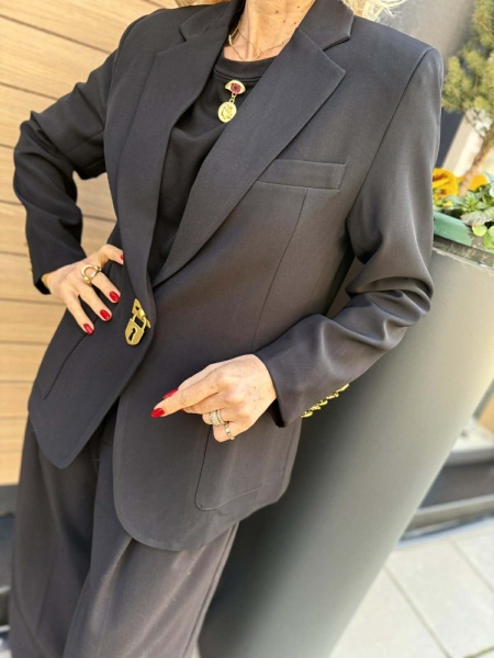 Сако със свободна кройка в черен цвят с декорация от златисти акценти по ръкавите. Универсален размер.