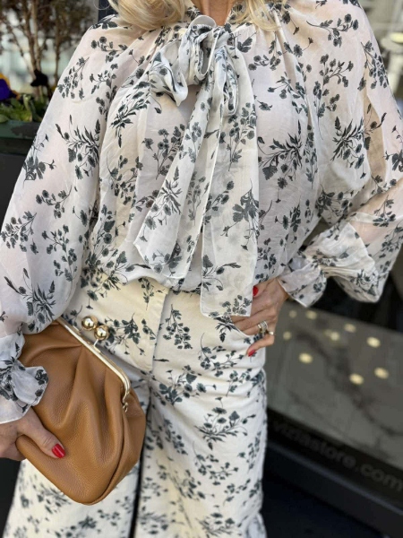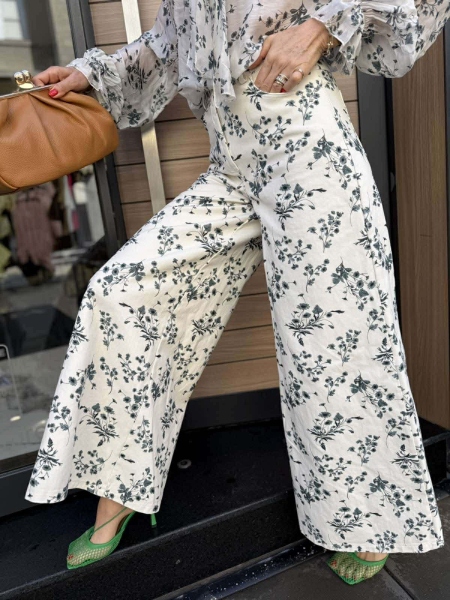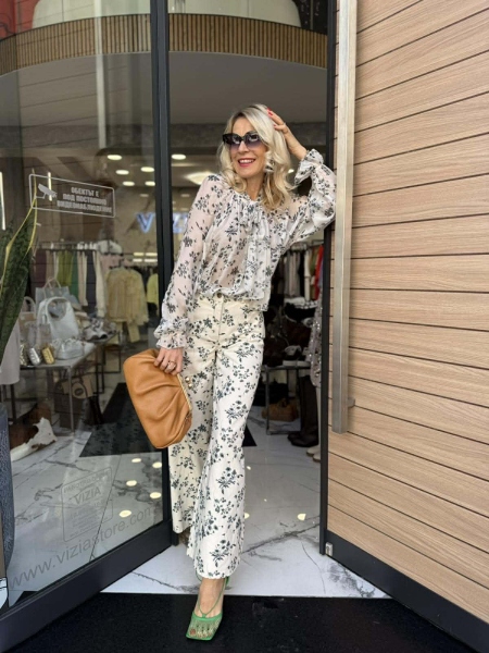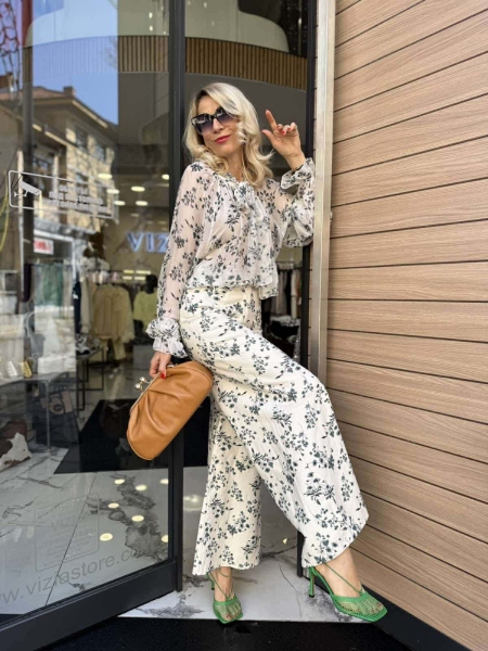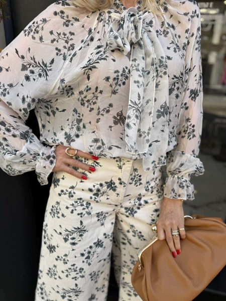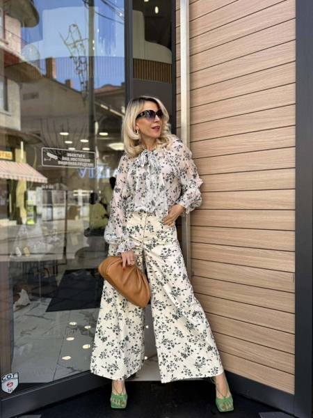 Риза и панталон в бежов цвят с флорален десен. Ризата е от фина материя със свободна кройка. Панталонът е от деним с многи широки крачоли и се закопчава с цип и копче.