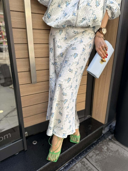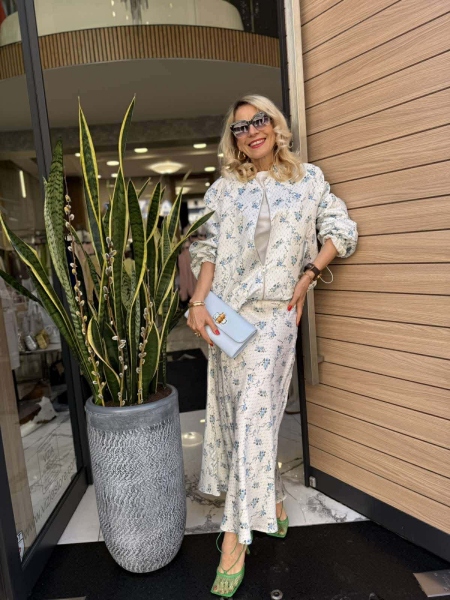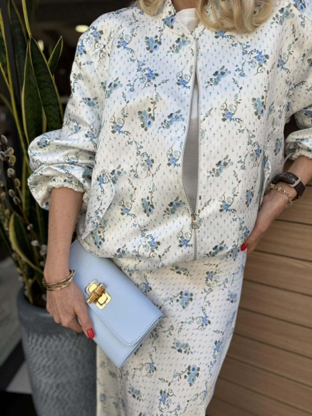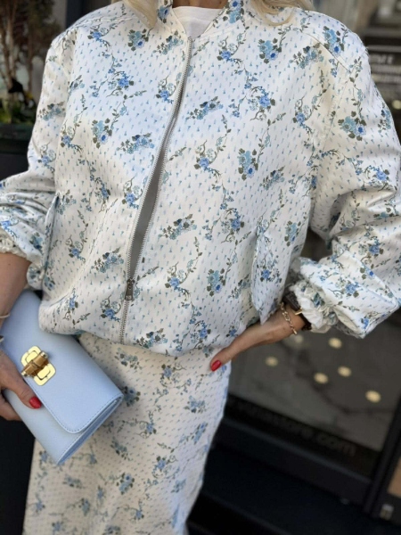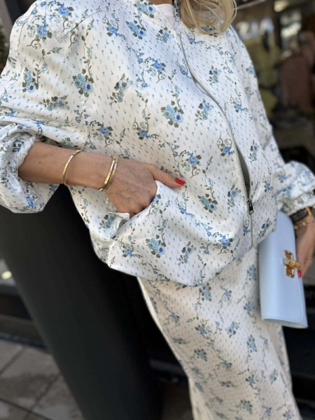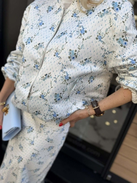 Комплект яке и пола в бял цвят с флорален десен от сатенирана материя. Якето е тип бомбър с обемни ръкави съ стопери. Полата е миди дължина с ластик на талията.