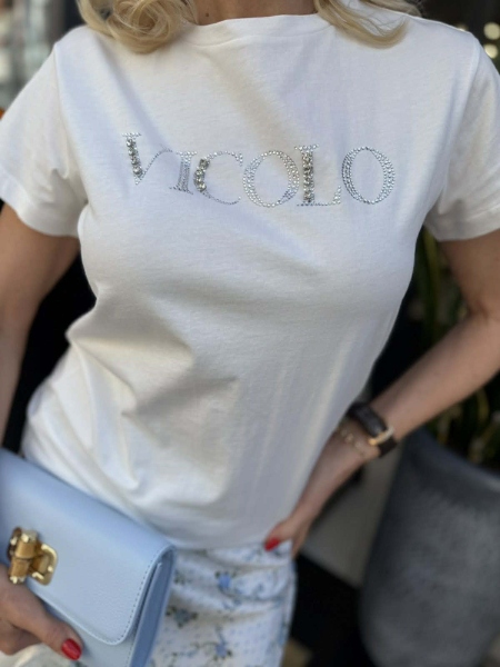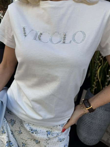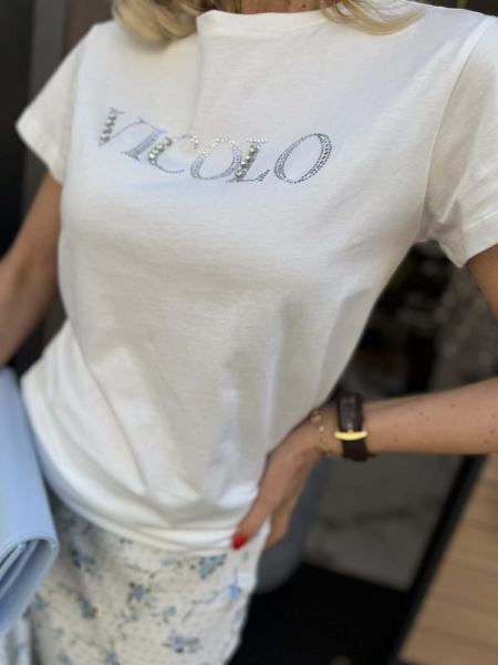 Тениска в бял цвят от памук с декорация на бюста. Моделът е със свобонда кройка. Универсален размер.