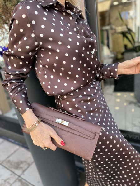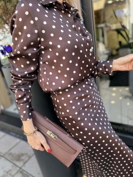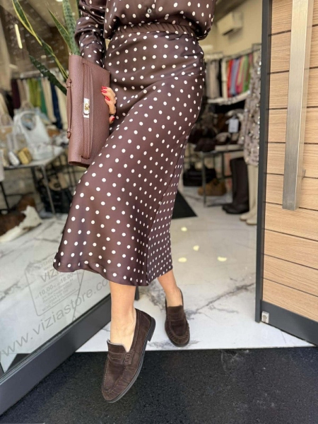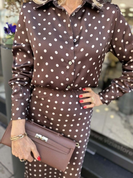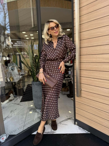 Комплект риза и пола в кафяв цвят на точки от сатенирана материя. Ризата е леко втален силует. Полата е с миди дължина и има ластик на талията.