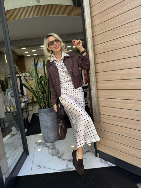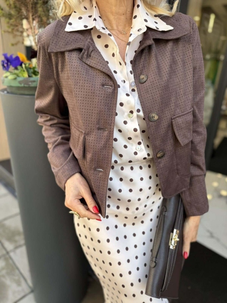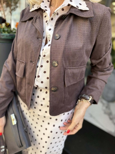 Яке от еко велур в кафяв цвят със свободна кройка и външни джобчета. Универсален размер подходящ за S,M.