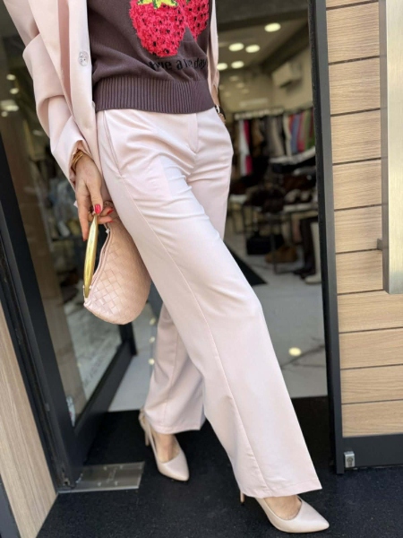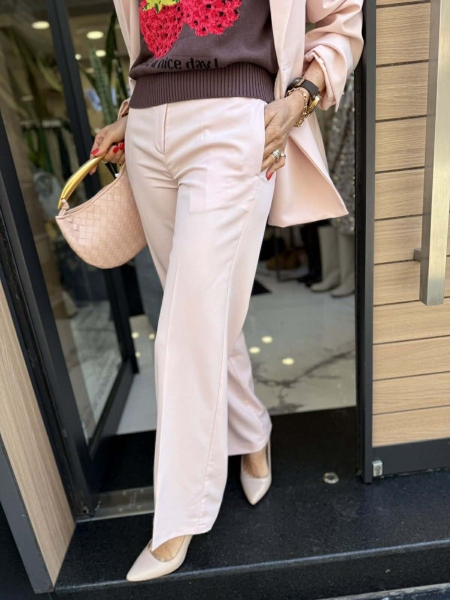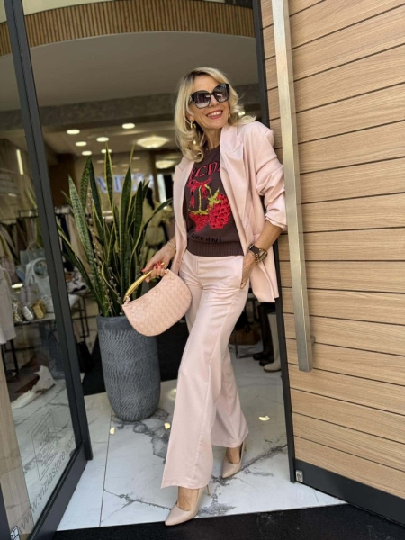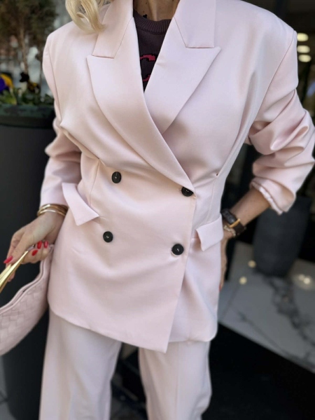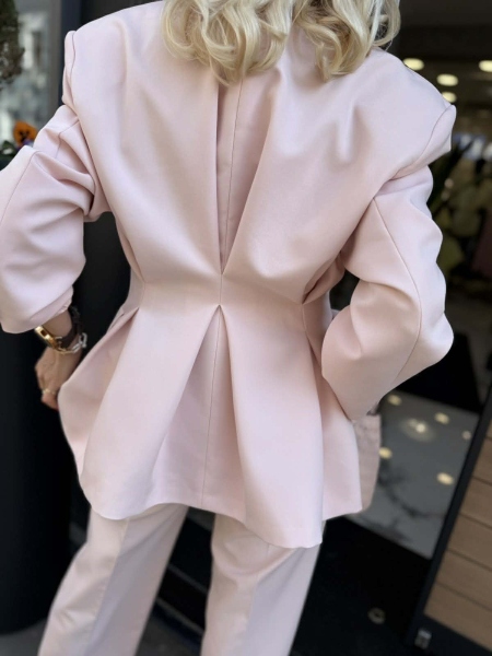 Комплект сако и панталон в светло розов цвят. Сакото е силно вталено с басти в задната част. Панталонът има прави крачоли с ръбове и се закопчава с цип и копче.