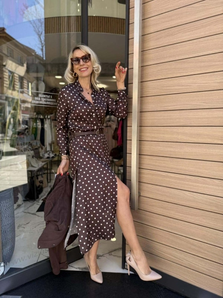 Рокля тип риза от сатенирана материя с цепки от двете страни. Към нея има и колан за талията.