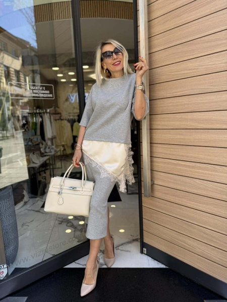 Комплект блуза и пола от трико в сив цвят. Блузата е oversize кройка с пришита част от сатен и дантела. полата е с миди дължина, цепка и ластик на талията. Универсален размер подходящ за S/M.