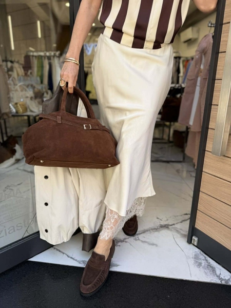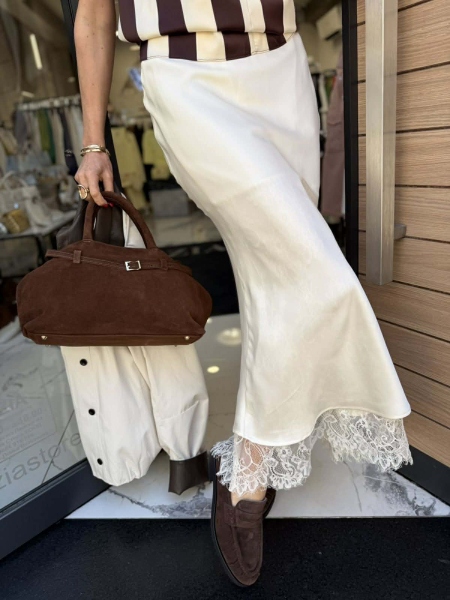 Пола с миди дължина от сатенена материя в цвят екрю с декорация от дантела. Моделът е с ластик на талията. Универсален размер.