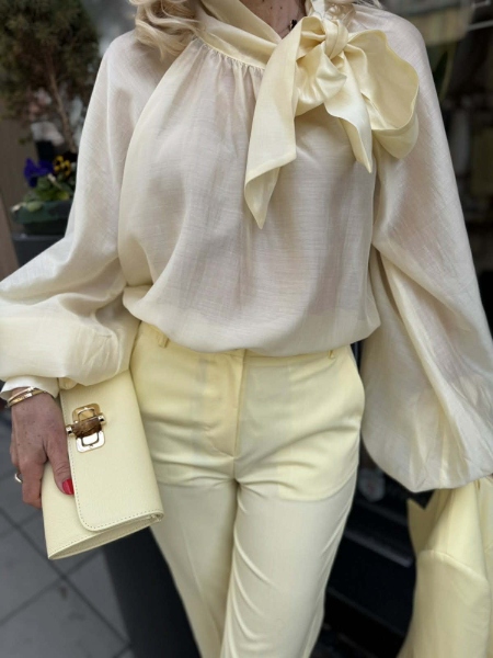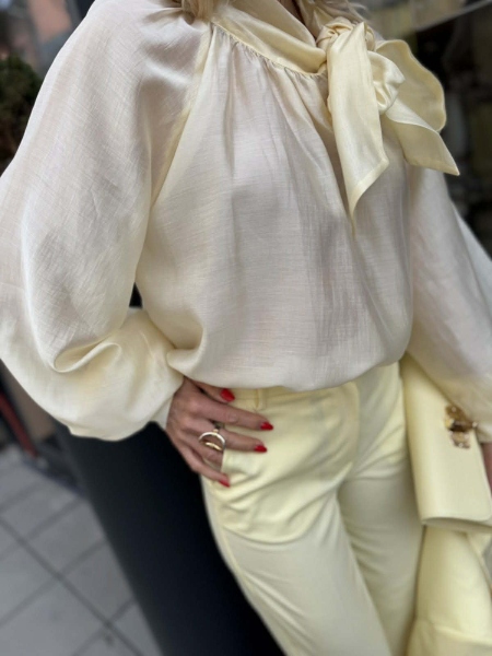 Риза в жълт цвят със свободен силует и буфан ръкави. Моделът в горната част е с шал яка. Универсален размер.