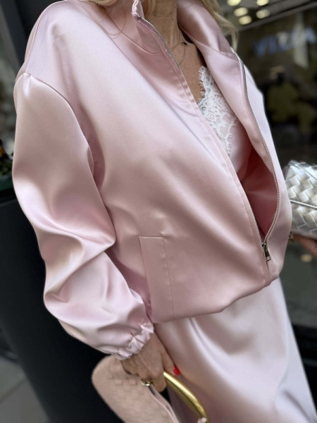 Комплект в розов цвят от сатенирана материя. Якето е тип бомбър, закопчаване с цип и ластик в долната част на талията. Роклята е с асиметрична кройка и декорация от дантела.