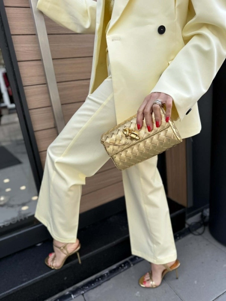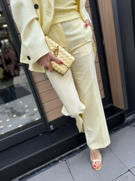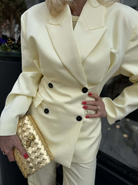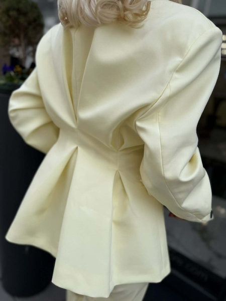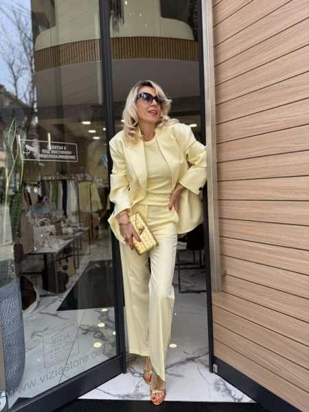 Комплект сако и панталон в светло жълт цвят. Сакото е силно вталено с двъредно закопчаване и басти на гърба. Панталонът е с прави крачоли с ръб и закопчаване с цип и копче.