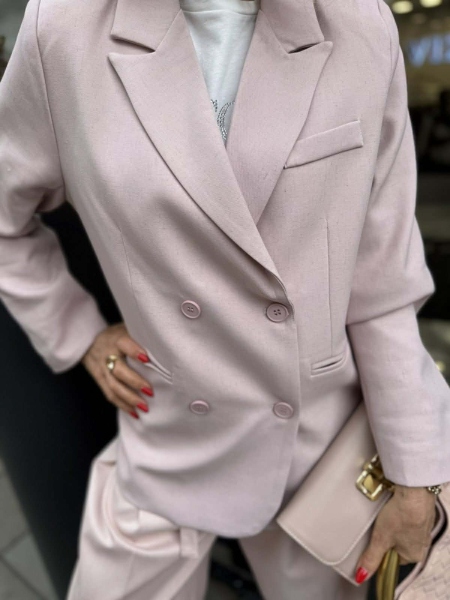 Сако в бледо розов цвят с oversize кройка и двуредно закопчаване. Универсален размер подходящ за M, L.