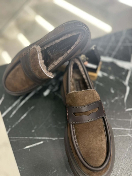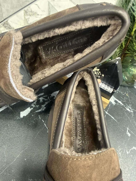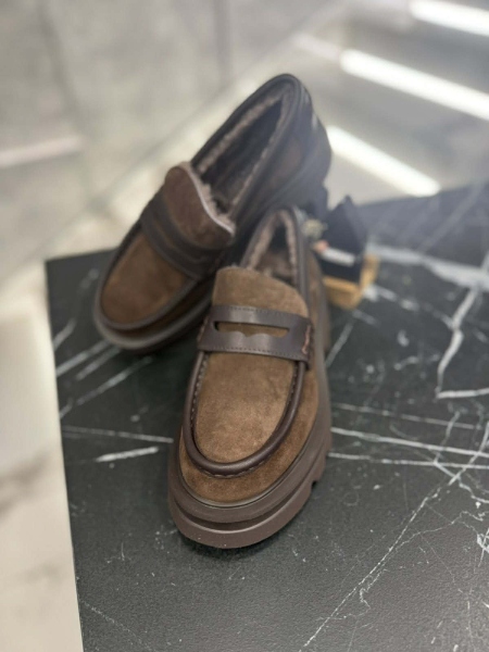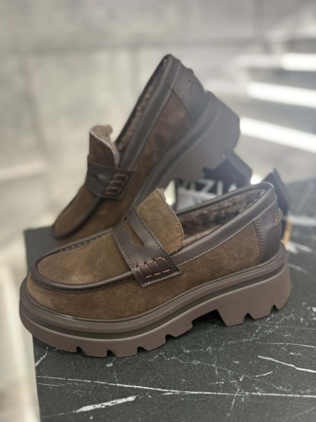 Лоуфъри от естествена кожа в кафяв цвят с дебела и равна подметка. Вътрешната част е декорирана с топла подплата. Моделът е заоблен в предната част.