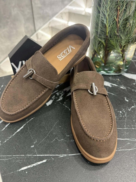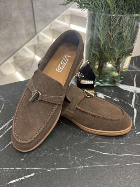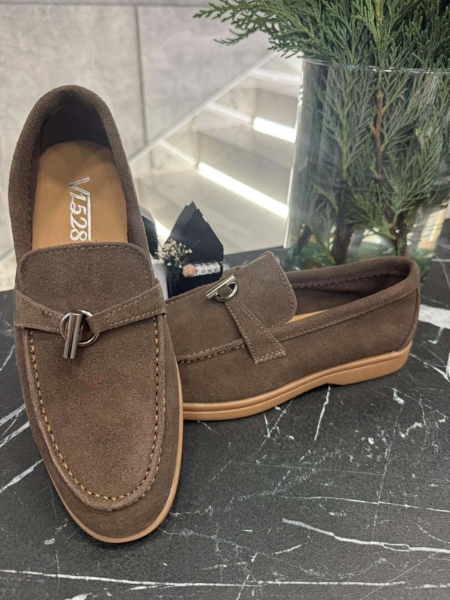 Мокасини в тъмно кафяв цвят от естествен велур с равна подметка.