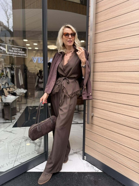 Комплект елек и панталон в кафяв цвят. Елекът е с вталена кройка, пришита дантела и закопчаване с копче. Към него има и колан. Панталонът е с широки крачоли с басти, ластик на талията и закопчаване с цип и копче.