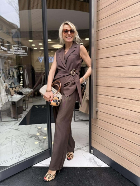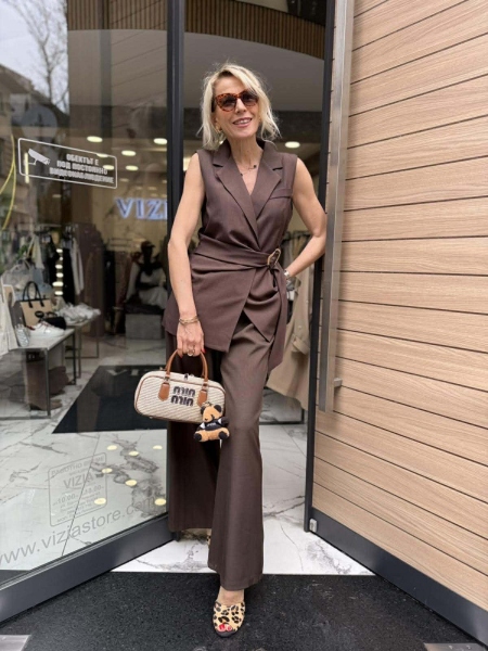 Комплект елек и панталон в кафяв цвят. Елекът е с вталена кройка. закопчаване с копче и пришит колан със златиста тока. Панталон с широки крачоли и басти, ластик на талията, закопчаване с цип и копче.