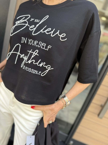 Тениска със скасена дължина и широка кройка от трико. Универсален размер.