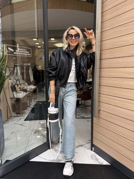 Късо яке от еко кожа в черен цвят тип бомбър. Моделът е с реглан ръкав, закокпчаване с цип и колан за прибиране. Универсален размер подходящ за S, M, L.