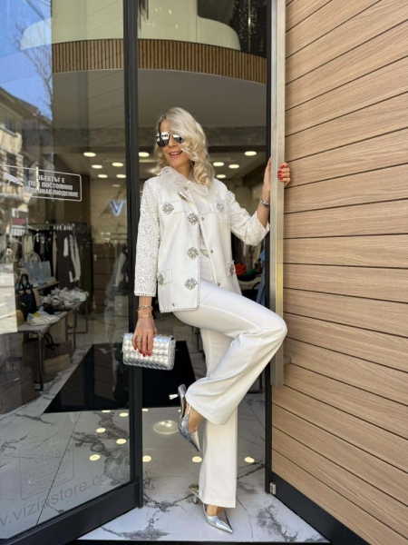 Комплект от три части с декорация от камъчета. Сакото е с права кройка, дантелени ръкави и закопчаване с копчета. Топ в бял цвят от прозрачна материя и шал яка. Панталон модел чарлстон с висока талия и закопчаване с цип.