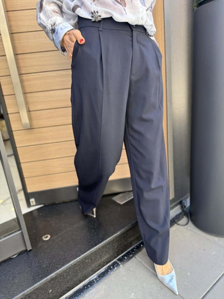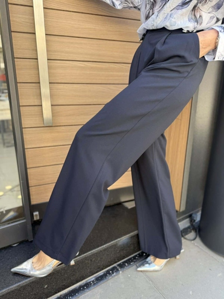 Класически панталон с широки крачоли и басти в тъмно син цвят. Моделът има странични джобове и се закопчава с цип и копче.