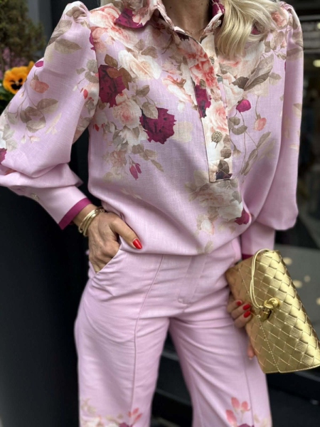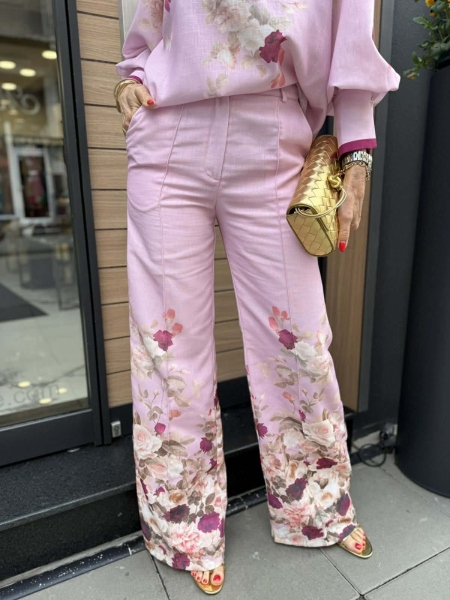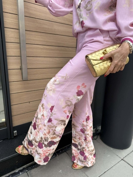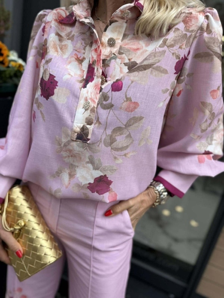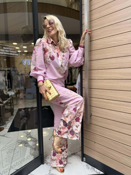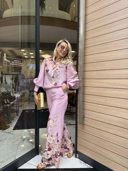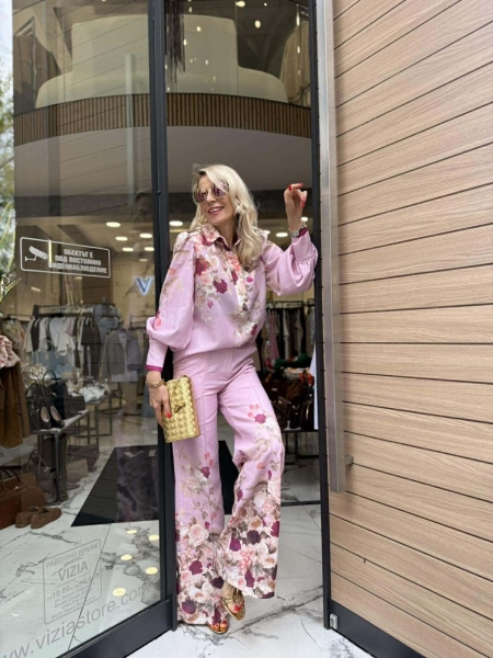 Комплект риза и панталон в розово- лилав нюанси с флорален десен. Ризата е свободна с големи маншети и буфан ръкави. Панталонът е с прави и широки крачоли и се закопчава с цип и копче.