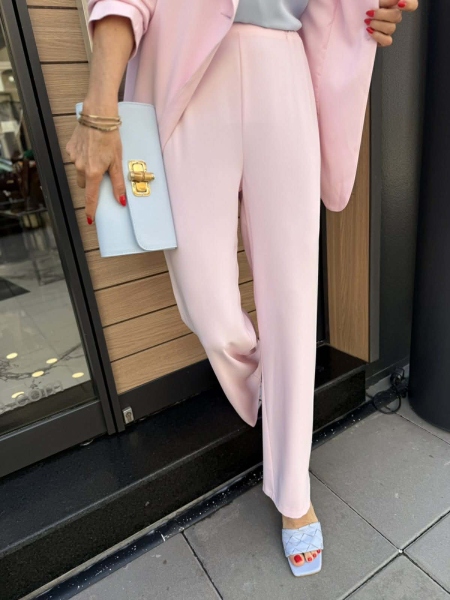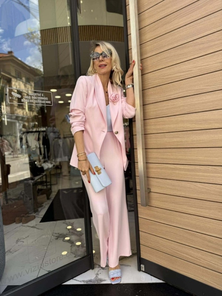 Комплект сако и панталон от тънка материя в бонбонено розово. Сакото е с втален силует, ревери и закопчаване с копче. Към сакото има и аксесоар брошка. Панталонът е с широки крачоли и ластик на талията.