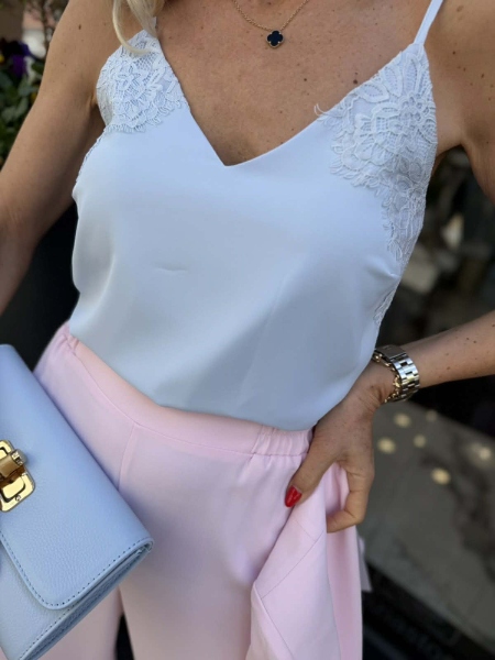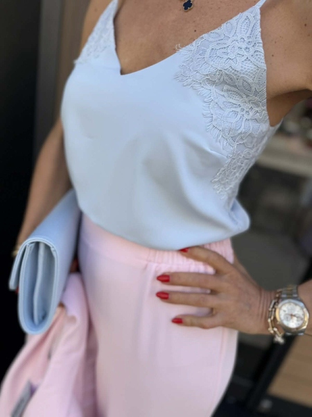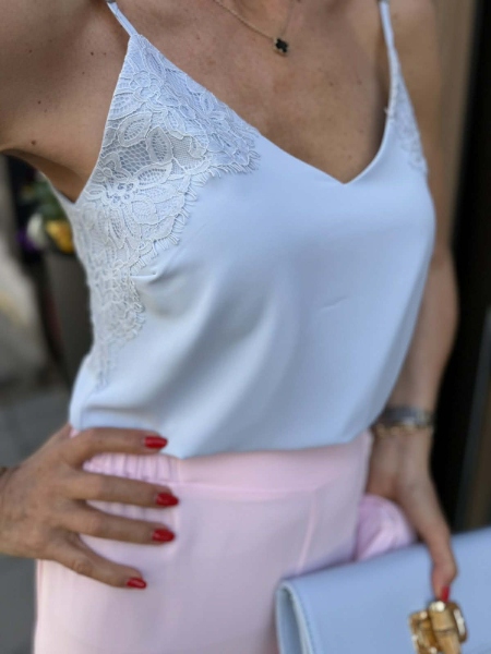 Топ от фина материя в светло син цвят с декорация от дантела. Моделът е с права кройка и тънки презрамки, които могат да се регулират.