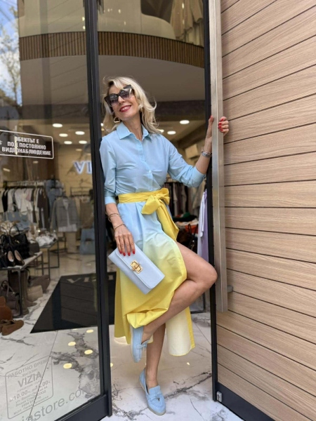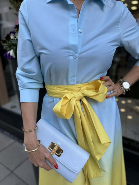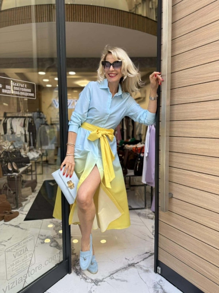 Рокля тип риза в преливащи се цветове. Моделът е с шев на талията, закопчава се с копчета и има колан от същата материя за вталяване.
