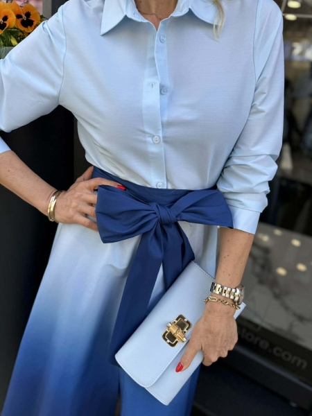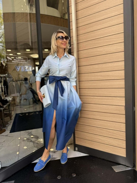 Рокля тип риза в преливащи се цветове. Моделът е с шев на талията, закопчава се с копчета и има колан от същата материя за вталяване.