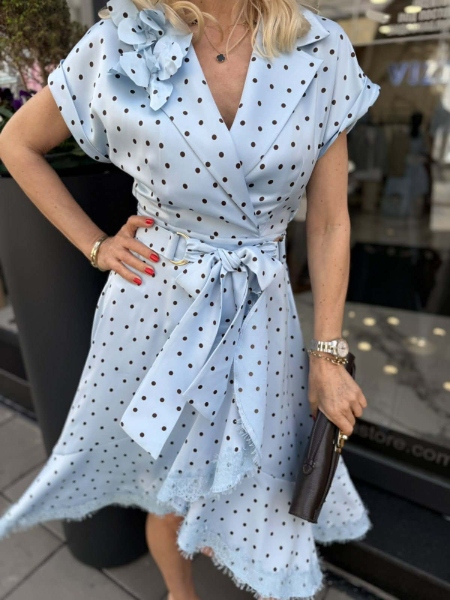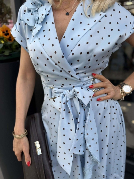 Рокля от сатенирана материя с остро деколте и прехвърляне в долната част. Моделът се закопчава с цип и има аксесоар колан.