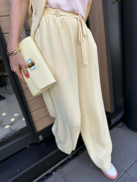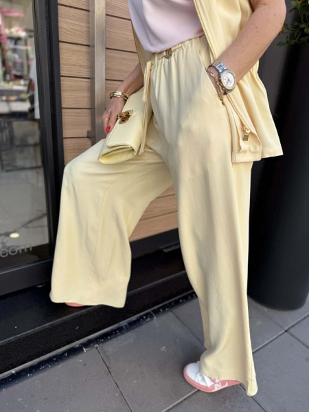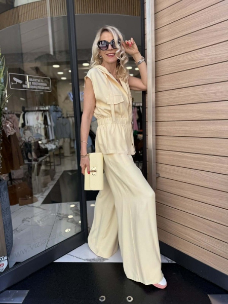 Комплект елек и панталон от фина материя в светло жълто. Елекът е с ластик на талията, закопчаване с метален цип и качулка. Панталонът е с широки крачоли и ластик на талията.