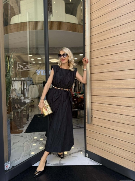 Рокля от шлиферна материя с леко намачкан ефект. Моделът има подплънки и ластик в задната част на талията.