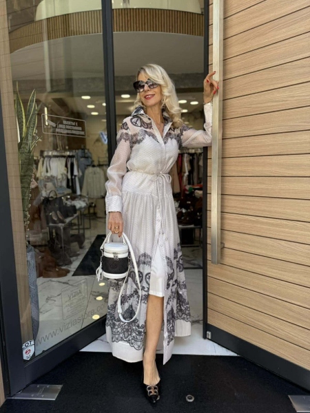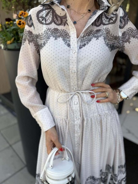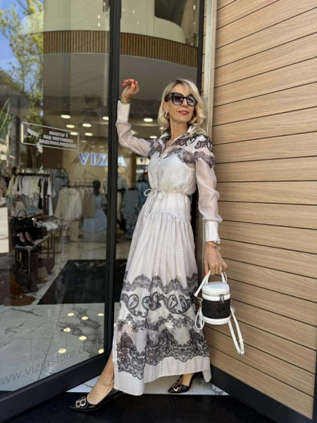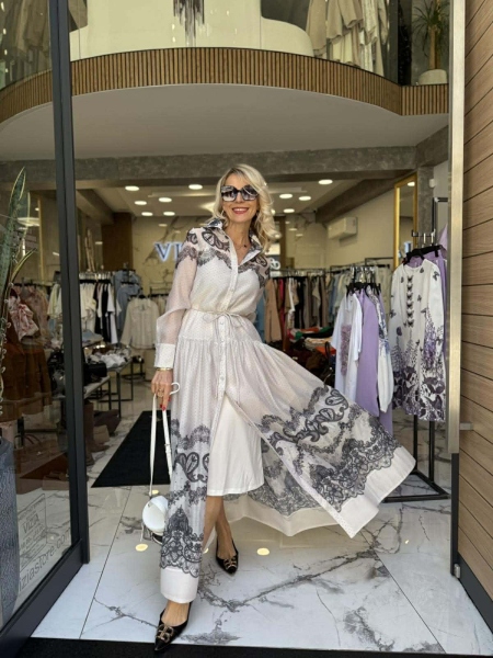 Дълга рокля тип риза в бяло- сив меланж със сиви щампи. Моделът се закопчава с копчета, има подвижна подплата и тънко коланче за талията.