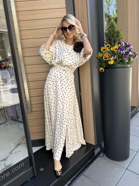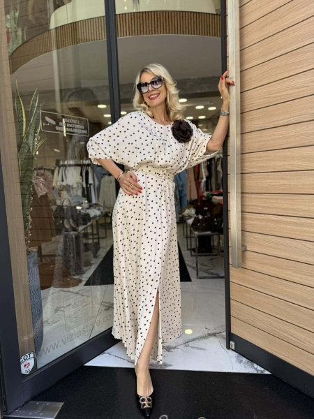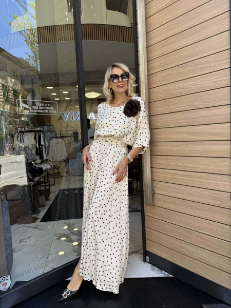 Дълга рокля в екрю от фина материя с десен от кафеви точки. Моделът е с шев на талията, реглан ръкави и свободна долна част. Моделът се закопчава с цип. Към роклята има аксесоар брошка цвете и колан за талията.
